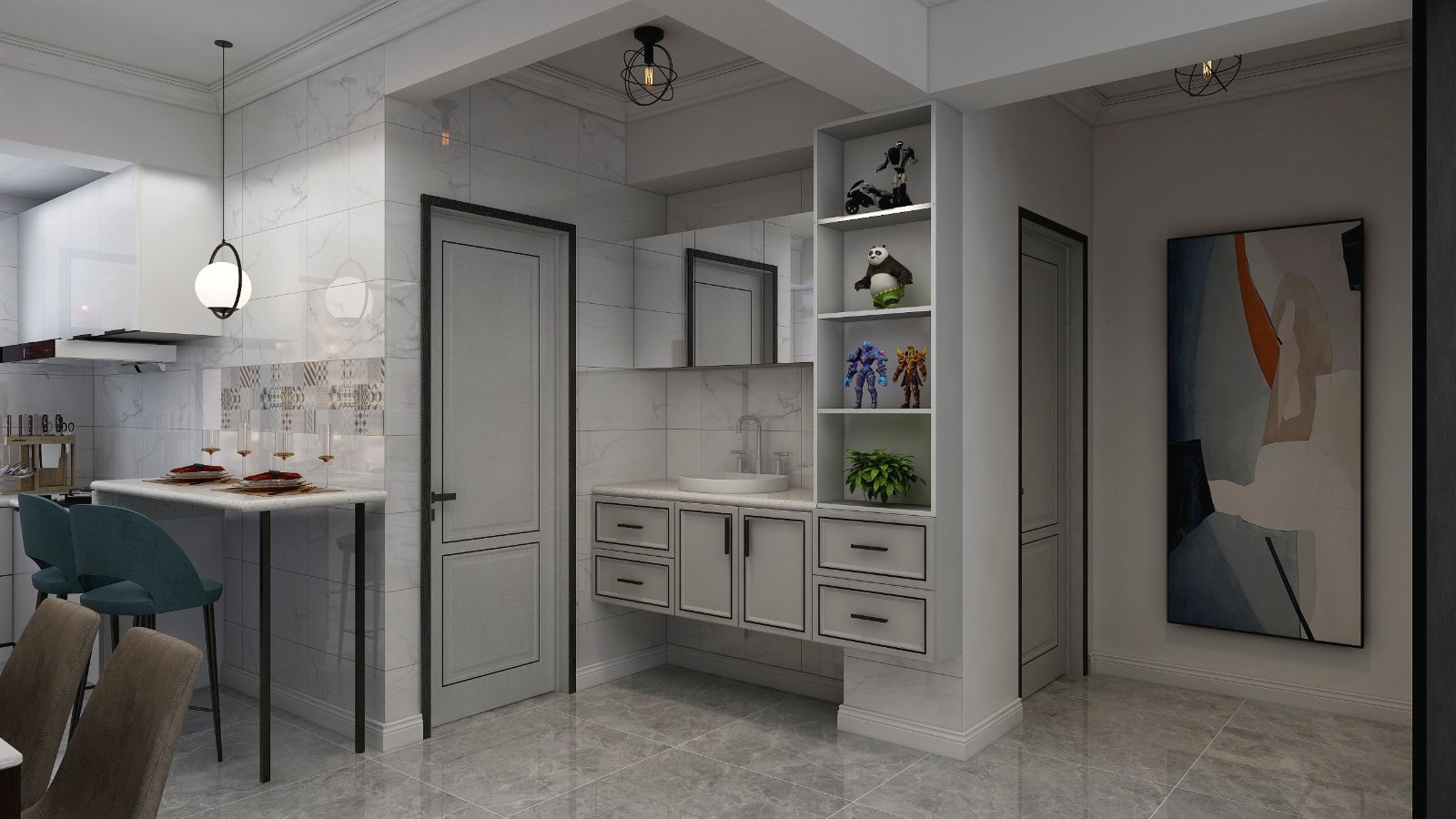 使用开放式的布局处理,不但释放了空间的狭隘,也让餐厅区域更加融贯一体,营造延伸流畅的格局序列,并采用冷灰色调打造基底,凝练简约现代的生活质感,加上室外光线的流泻,衬出选用材质的自然肌理,在布艺的温润细致与石材的刚硬冷冽相互交织之下,勾勒出独特的空间气质。
