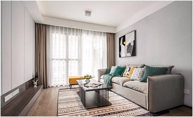 客厅浅灰色系的沙发,搭配彩色花纹的地板,彩色的抱枕,简洁而不单调。