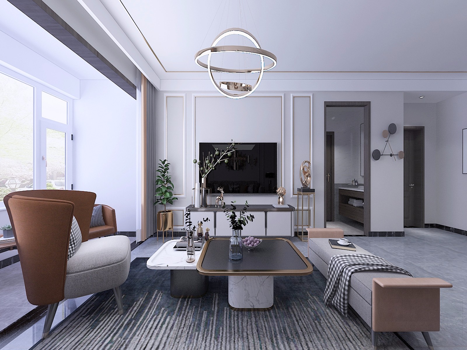 客厅:客厅装修家具方面,采用灰色调家具以及金属元素家具和墙面顶面的的点缀,营造出沉稳却不失时尚的氛围。地面的装修,选择灰色大板瓷砖来装饰,使得整个客厅简约舒适中透露着轻奢的感觉。