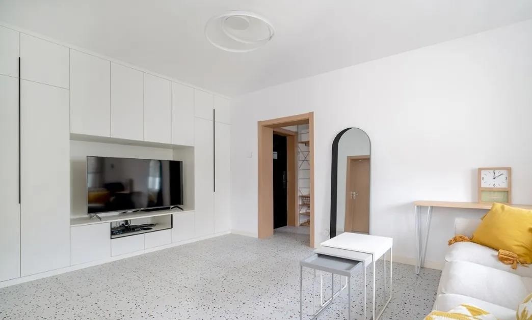 客厅:电视背景墙做满墙的600mm深收纳柜,柜体材料为爱格板,中间预留电视位置;600*600mm水磨石地砖;墙面整体刷白