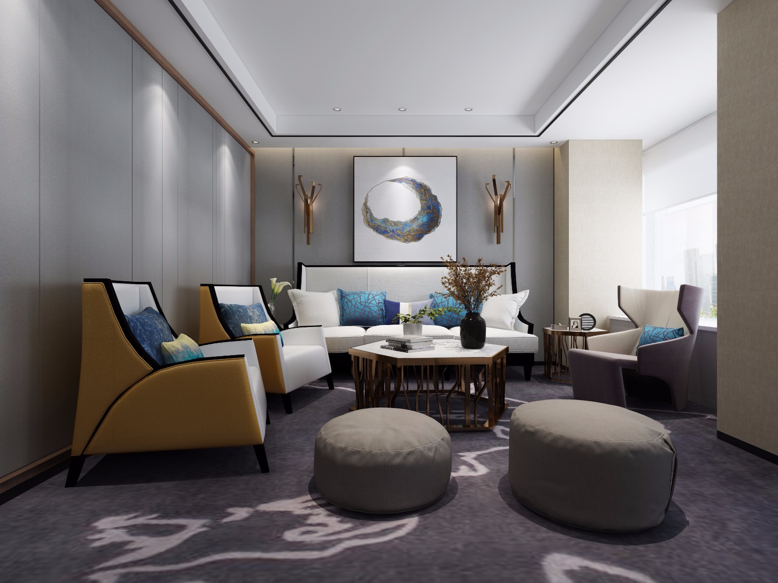 前厅区采用后现代简约风格,空间运用不同材质互相碰撞、对比,使整个空间更有层次和张力。