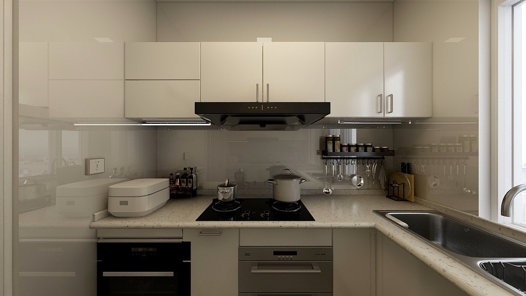 厨房以灰色砖为主,营造出明亮整齐的空间。高位出水龙头,嵌入式微波炉和烤箱,净水器一应俱全,操作台面为L型橱柜,洗菜盆靠窗通风好,水渍易干,不易潮湿,滋生细菌,吊柜下安灯照明,方便操作
