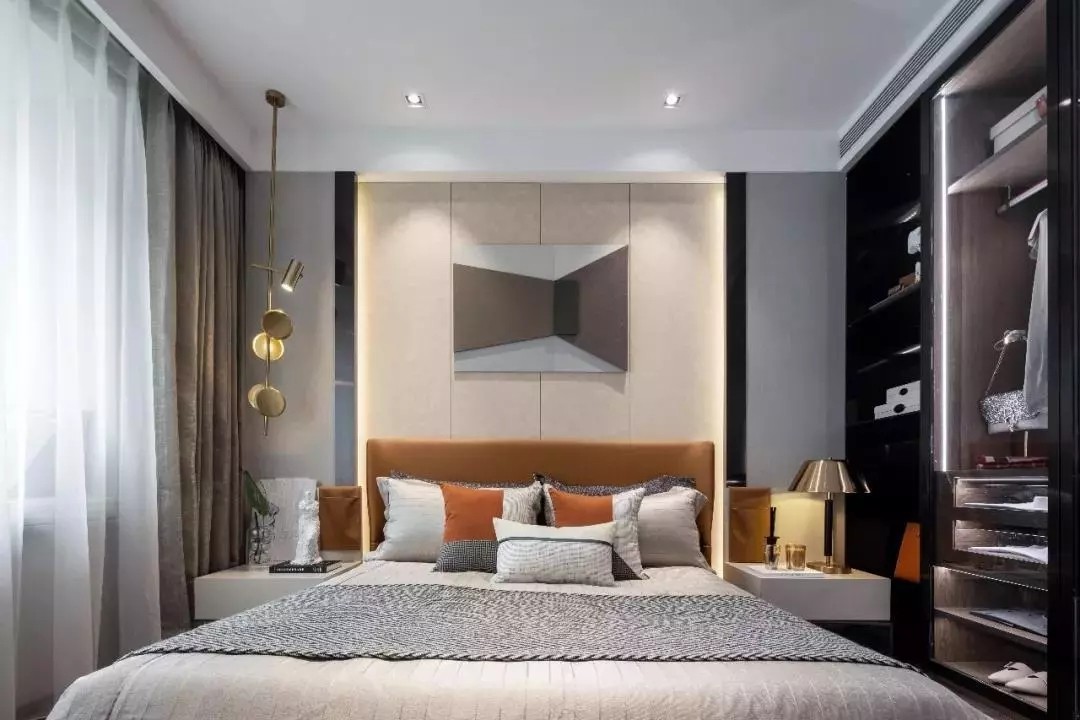 主卧硬装造型展现出强烈的现代感,软装陈设由硬装延伸而出,背景挂画采用空间形式的立体绘画增加整体纵深感。