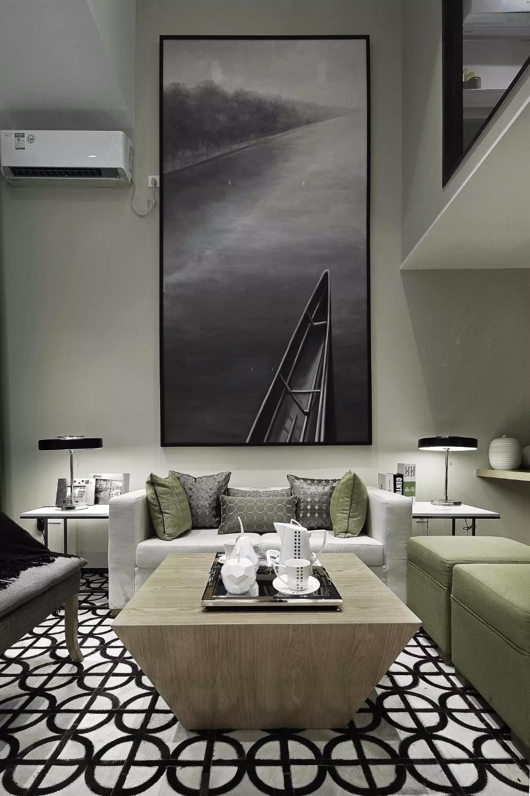 浅灰色的墙面搭配大幅的现代艺术画让单调的墙面富有艺术色彩。