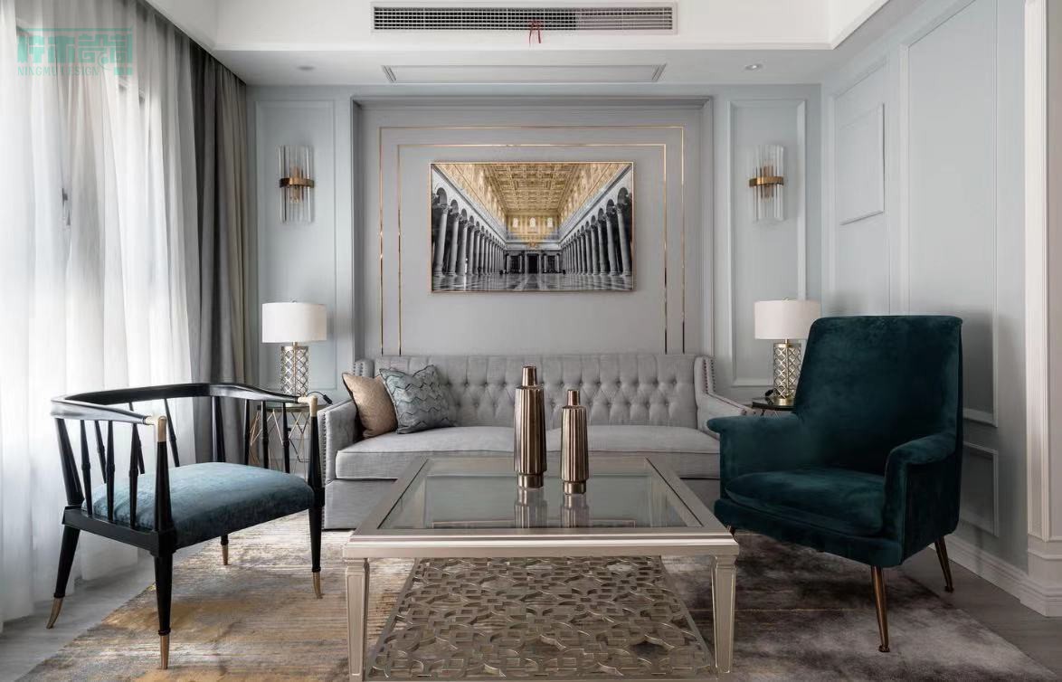 客厅***灰+金属色+绿色,蓝色+白色+黑色的组合形式。运用重复性,放射性,几何图案和线条。