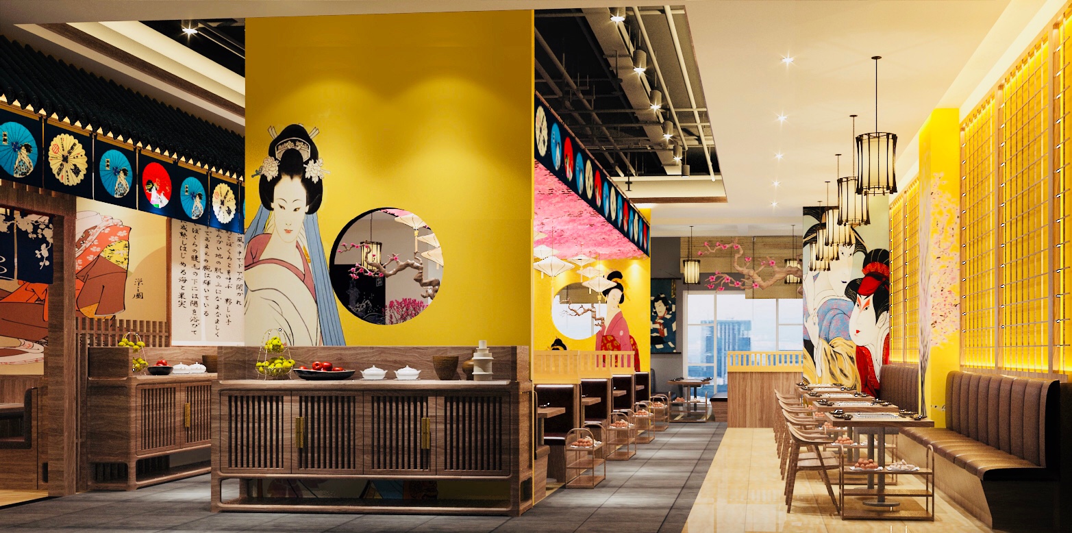 嫣然欲笑媚东墙,绰约终凝胜海棠。 樱花图案布满餐厅,顿使餐厅充盈着浓郁日式风格。