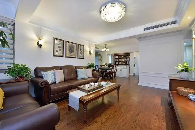 客厅,餐厅往里走就是客厅区,家具和软装都采用了美式的元素,一眼望去给人一种沉静休闲的感觉,沙发墙面刷的是大白,配上几个木质框的装饰画和精致的壁灯,简单又不失雅致,墙下边摆上了一整套的深色系的皮质沙发和单人沙发,有种稳重大气又舒适的***感