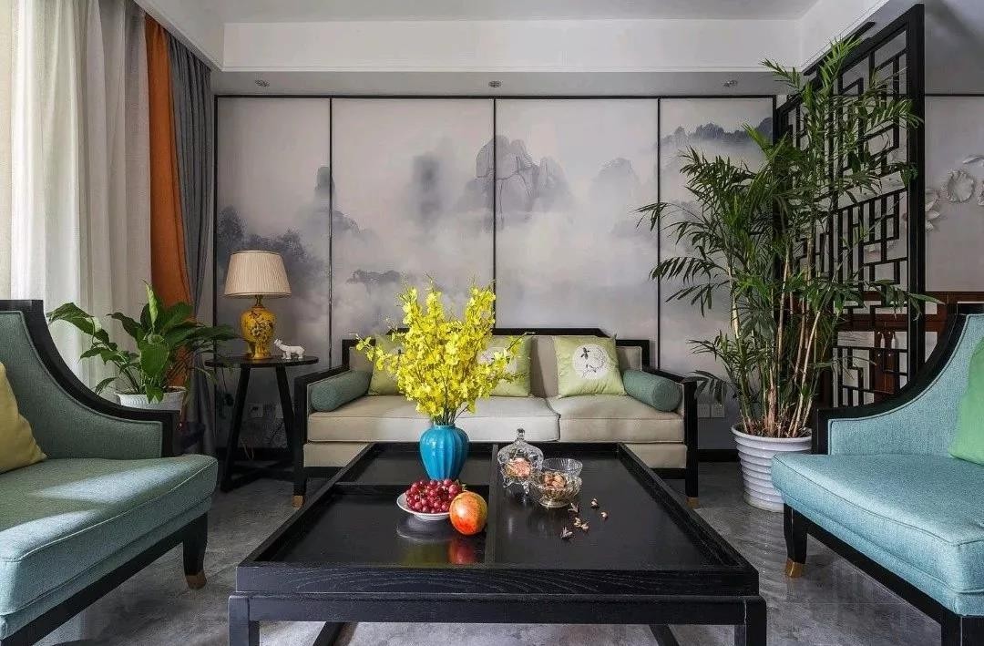 客厅的硬装设计尽量简洁,再搭配一些新中式家具,营造出一个中式韵味的空间氛围
