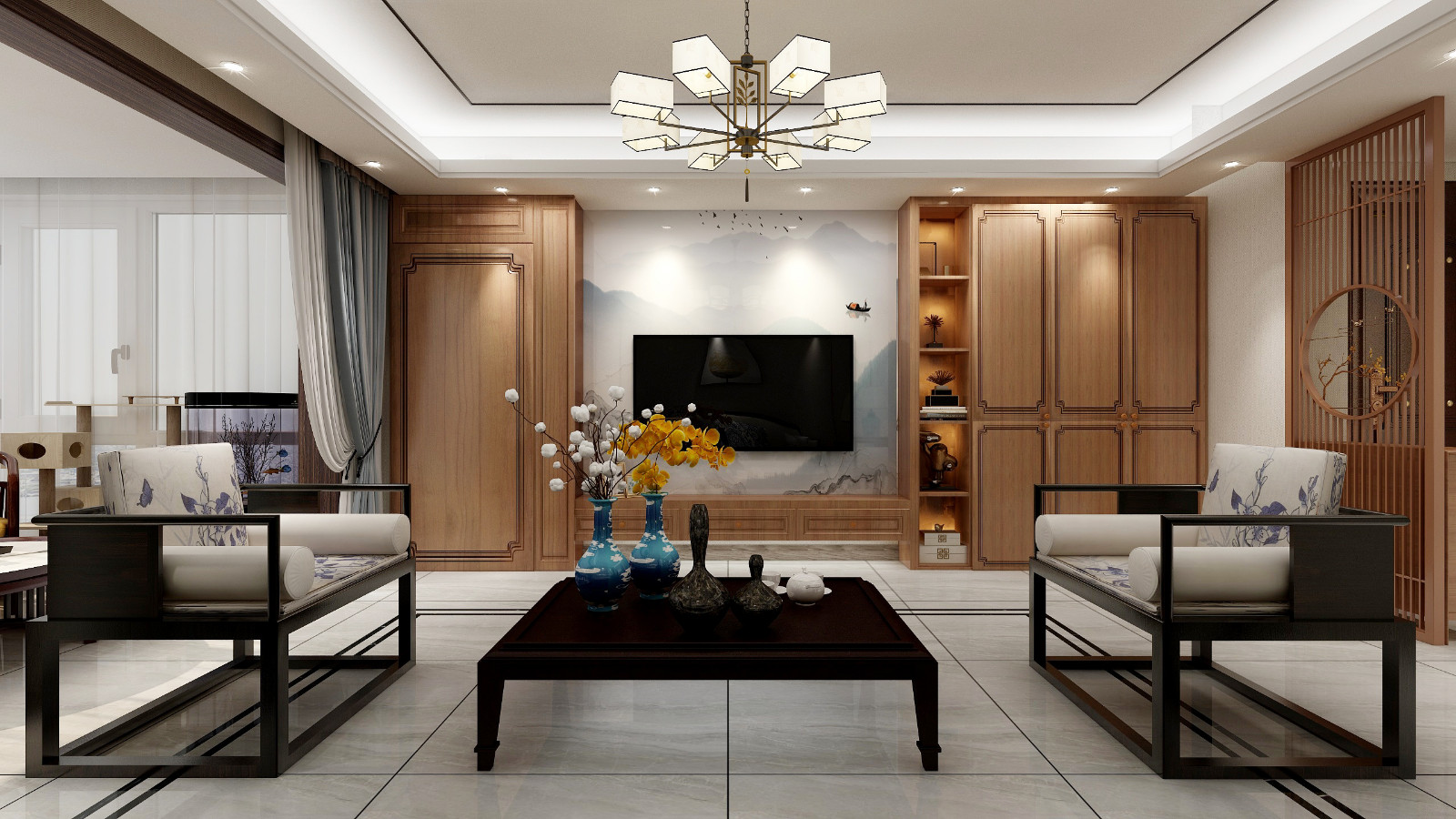 客厅选用中式风家具进行装饰,电视墙铺贴山水画壁纸,充满了意境。