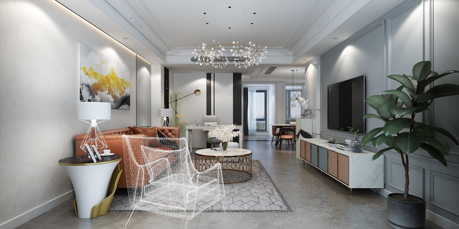 部分大理石加石膏线装饰组成电视背景墙,天花吊顶的雕花更显的客厅的优雅精致。