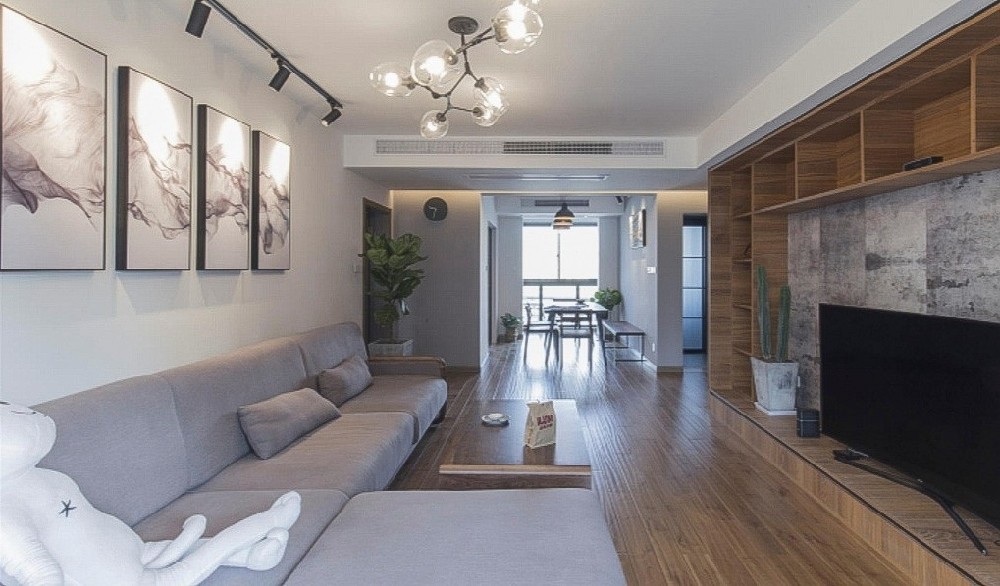 电视柜与地板的颜色相融合,使得空间看起来重心不稳,而丰富了沙发背景墙的挂画,使空间互相牵制得以平衡。木质的整体电视柜,前后做了层次,使柜体看起来丰满又不压抑,北欧的大型家具,后现代的铁艺吊灯,抽象的挂画,完美的混搭在一起