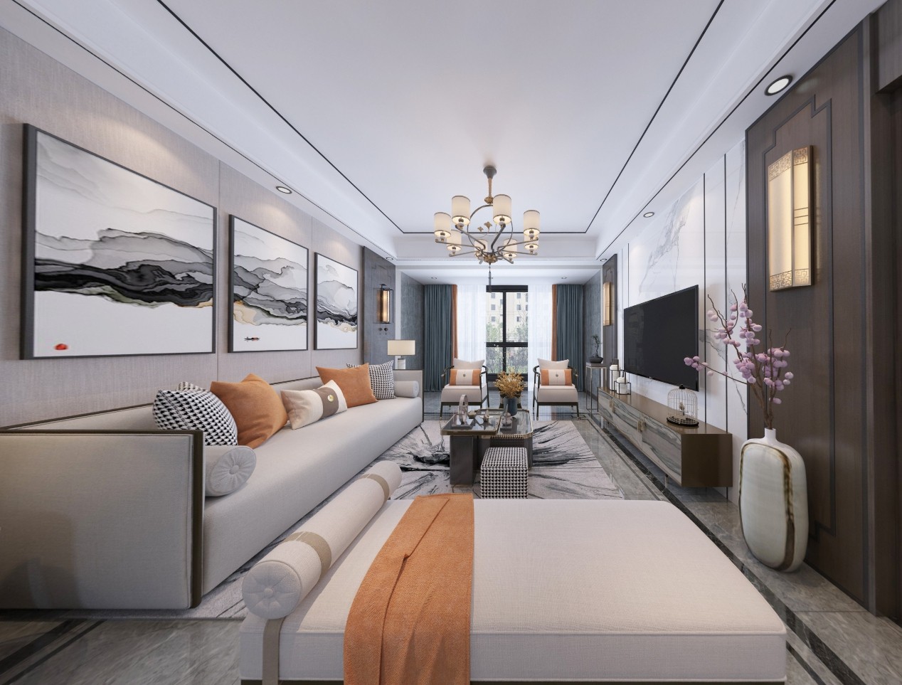设计师选择简约的基础硬装搭配中式家具,背景墙融合了写意山水,既满足屋主期待,又别有一番韵味。