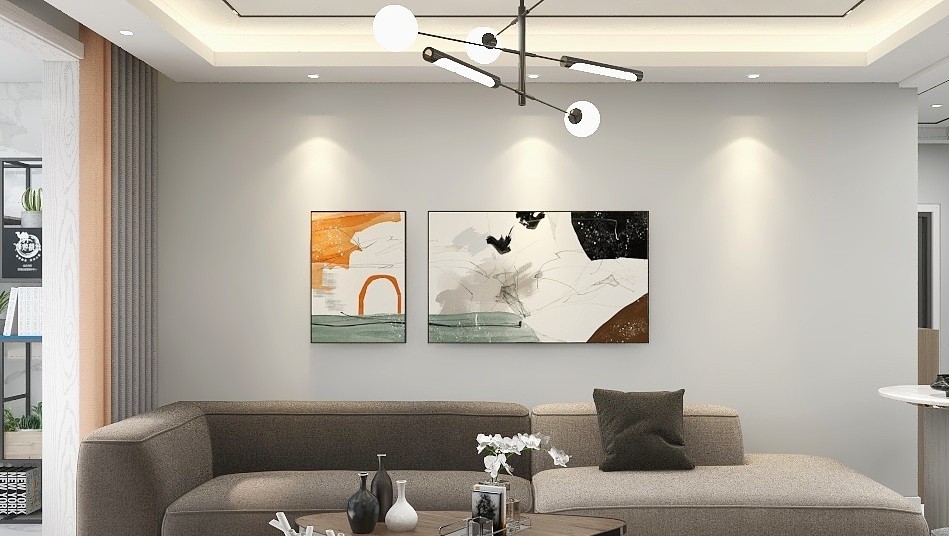 鄙弃了原始的现代风格,有区别于但又保留,极简式沙发搭配灰黄色系挂画,增添了空间的层次感