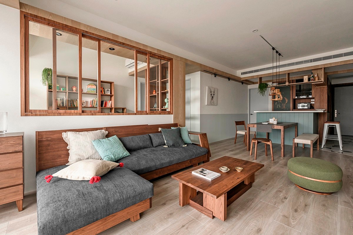 餐厅木桌,透过朴实温厚的木质框线串连公空间视野,看似巧妙融合为一体,实则明确定义出区域分野。