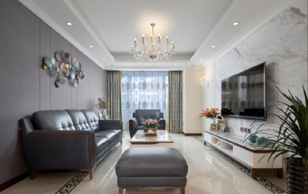 灰蓝色的皮质沙发,灰色的棉麻硬包背景墙,搭配不规则金属装饰挂件,通过挂件的亮色点缀,大理石的茶几和电视柜台面和电视背景墙的大理石相互呼应。白色隔断屏风使得客厅空间和餐厅以及过道相对整齐。湖蓝的窗帘点亮整个空间,调和了皮质以及大理石的硬朗感,给空间带来温柔的居家氛围。