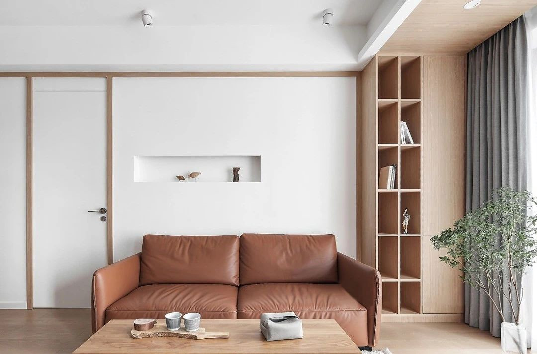 非对称性设计是日式美学的一大特征,设计师在背景墙面的设计中运用这一手法,以简单的线条以及不同的材质,打造虚实相间之景