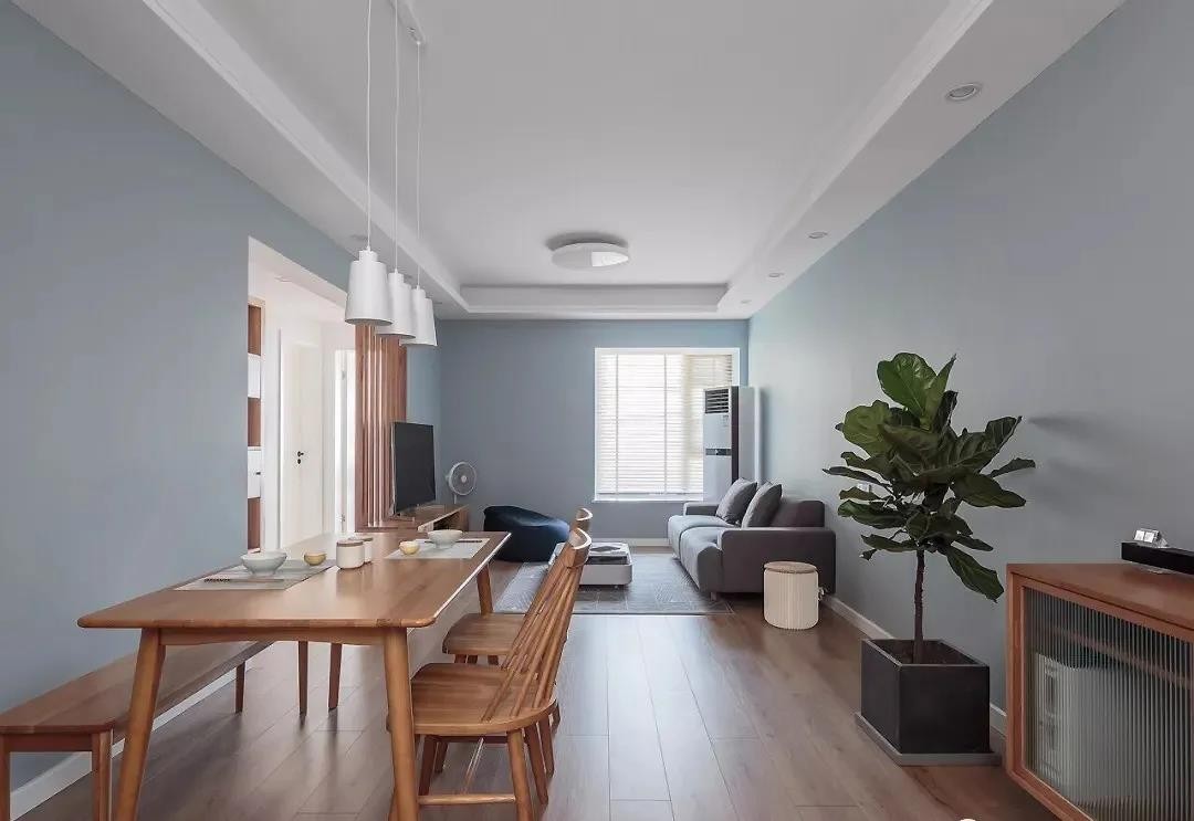 整体空间以灰蓝色为主调,灰色布艺沙发简约而有质感,木质家具与清新绿植的加入,营造舒适惬意的生活氛围。