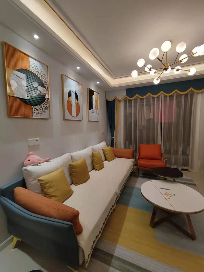 孔雀蓝与橘色为整个软装的主色调,整个空间显得温馨而又活泼