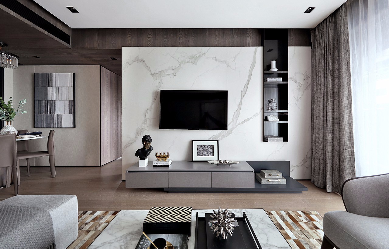 整个客厅软硬装中运用了各种不同材质切换,丰富空间层次。