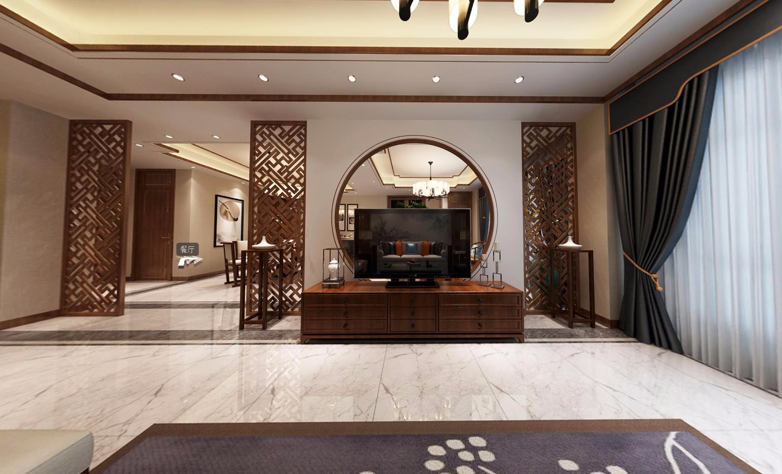 客厅电视背景墙采用圆形镂空几何体,提升整体的通透感