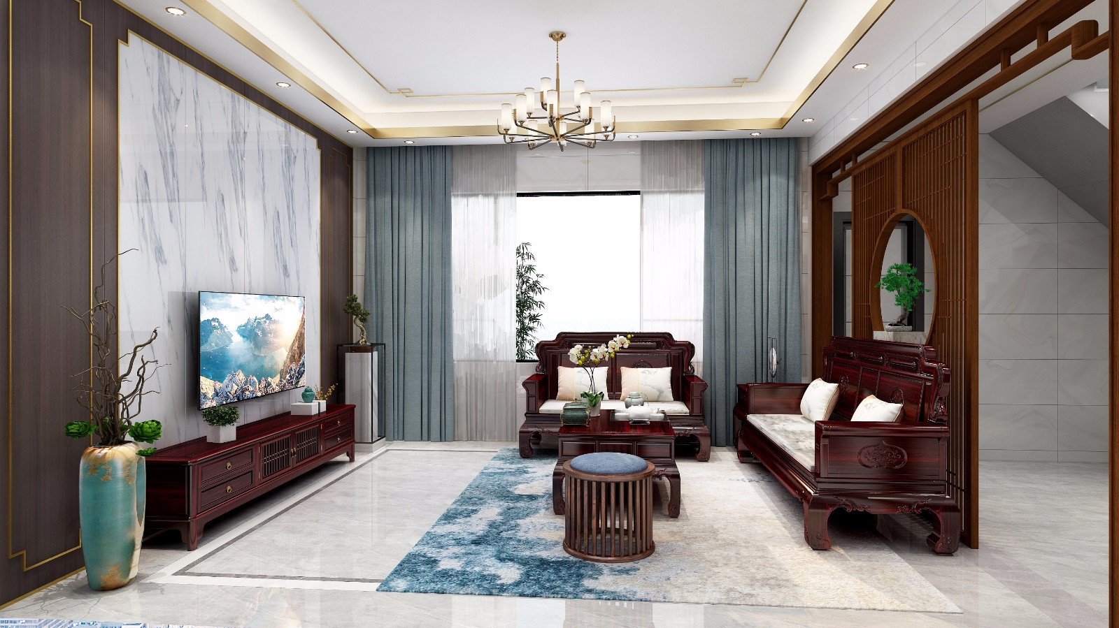 餐厅是圆桌布局,利用落地窗入室采光,金色镶边的天花吊顶搭配红木餐桌椅是满满的贵气所在。
