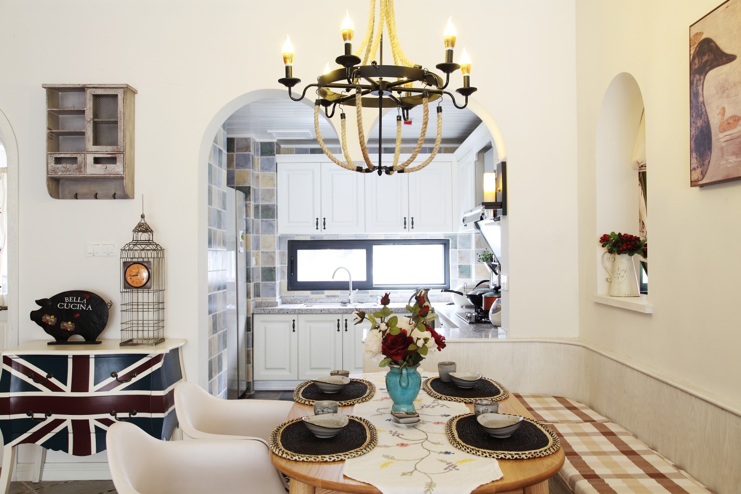 餐厅采用卡座形式,节省空间。开放式厨房操作空间更开阔,操作方便舒适。