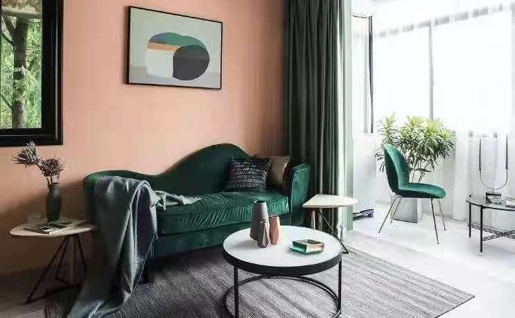 客厅沙发延续了绿色的主调,同时背景墙选择了粉橙色为主,利用颜色的饱和度,降低色彩的冲击感,带来更加舒适柔和的视觉感受,并且搭配了地毯增加整体装饰的自然感。