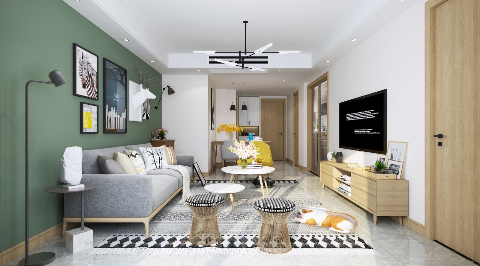 客厅空间很大,放置灰色沙发显得优雅而神秘。编制地毯复古创新,组成了一块温暖的空间。