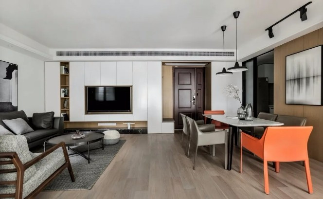整体空间客餐厅的采光较差,在设计布置的时候,摈弃了一成不变的设计方式,在大厅与房间之间加入折叠门的设计,让空间显得更加明亮舒适,布置以极简舒适的家具设计,让小户型也营造出温馨自然的的氛围感。