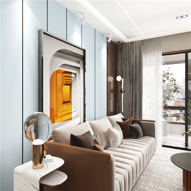 现代简约风格,带有灯带的吊顶,蓝色的沙发背景墙,还有白色与土灰色的家具软装