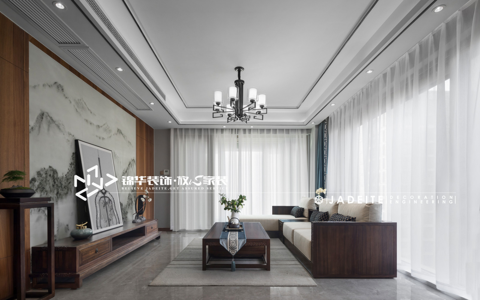 客厅两面落地玻璃,采用白纱帘来透光,烘托出一种文雅与风度,淡雅而静气。