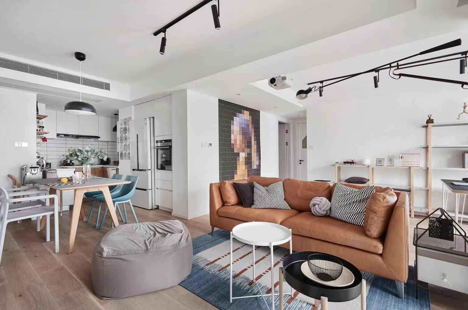 客厅沙发不靠墙的摆放方式很欧美,右边是开放式餐厅+厨房,后面是书房,空间增加了3倍。