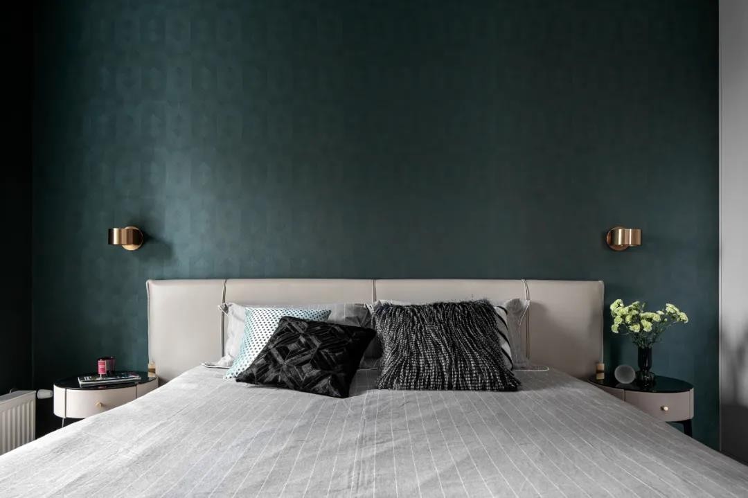 优雅复古的墨绿色是女屋主心仪的颜色,我们选择有纹理质感的壁布代替乳胶漆,再加入白鹭色调为主的床品家具及金属材质,让协调的色调里散发出高雅意味。