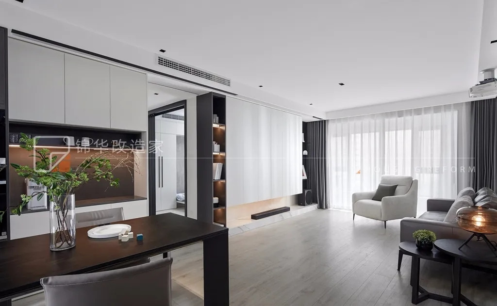 餐厨空间延续了主空间的设计风格,餐边柜收纳能力MAX,加装了灯带设计,使整个环境更具有通透性,呈现出了浓浓的现代气韵。