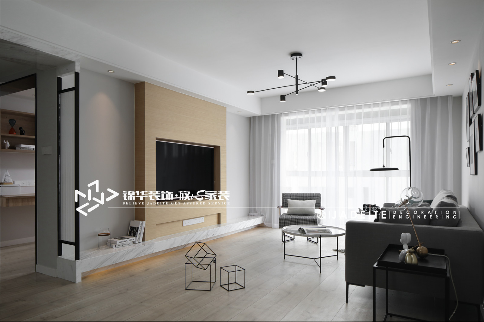 客厅选配的锦华软装的极家沙发,搭配纯净质感的茶几,透露出北欧的生活情调。