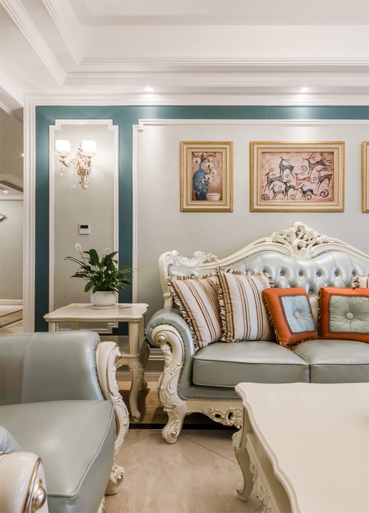 家具的选择,与硬装修上的欧式细节应该是相称的,选择淡雅白以及非常西化的造型的沙发,与大的氛围和基调相和谐