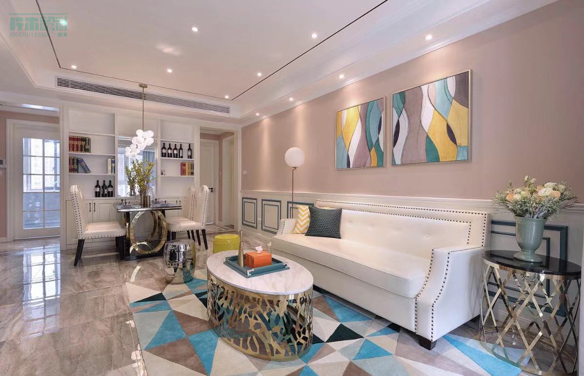 客厅主题皮革浅色沙发,镶嵌古铜色铆钉,在法式中透入一些复古。
