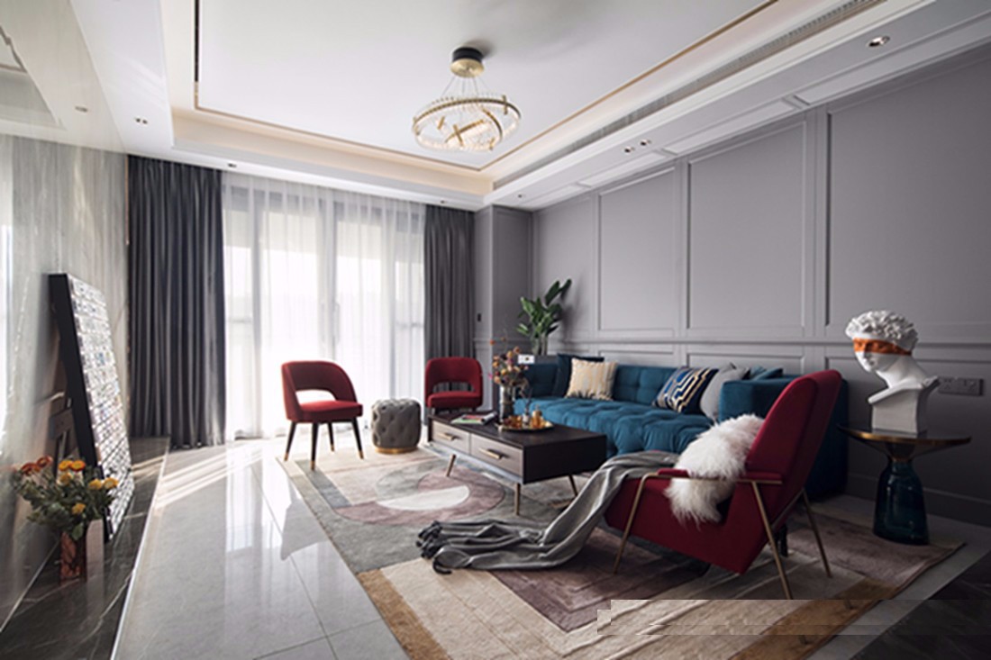 女业主李小姐是一个年轻的妈妈,希望打造家的颜色上是多***撞,既要温暖也要冷艳。男业主对家的概念就是,有女主人和孩子的地方那就是家。我们特别选用嫣红,橄榄绿,孔雀蓝作为主跳色,灰色作为大基调,古铜色作为点缀,希望营造出来复古轻奢质感。嫣红色不像是酒红色那么沉,轻松的表达了红对于这条作品的意义。橄榄绿则用在了男孩房,用护墙板和书桌结合的方式打色块呈现,凸显空间的干净与开阔。孔雀蓝绒面质感的主沙发面料淋