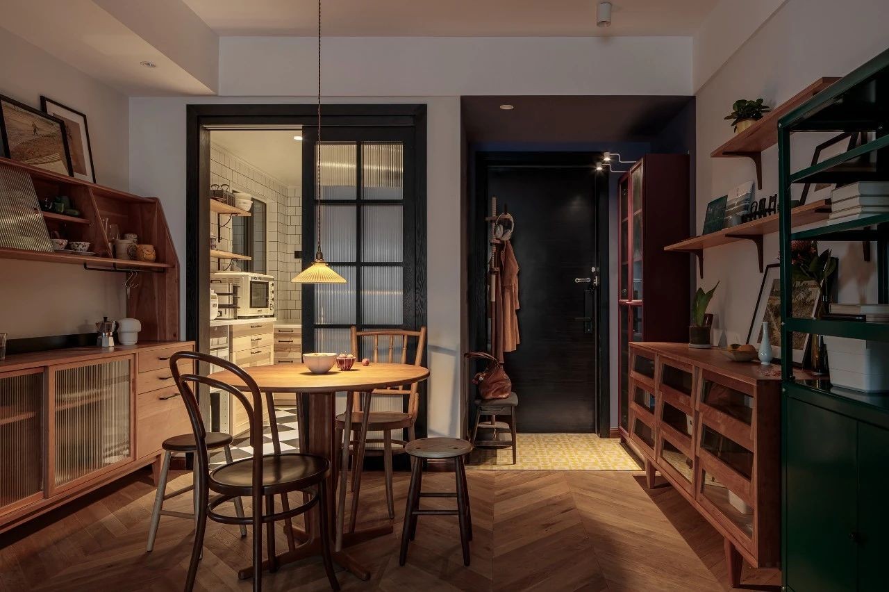 制造生活的***也是屋主日常的喜爱之事,所以在素朴的展示柜之间,多了一只淘回家的可爱且与之不同的墨绿书柜。