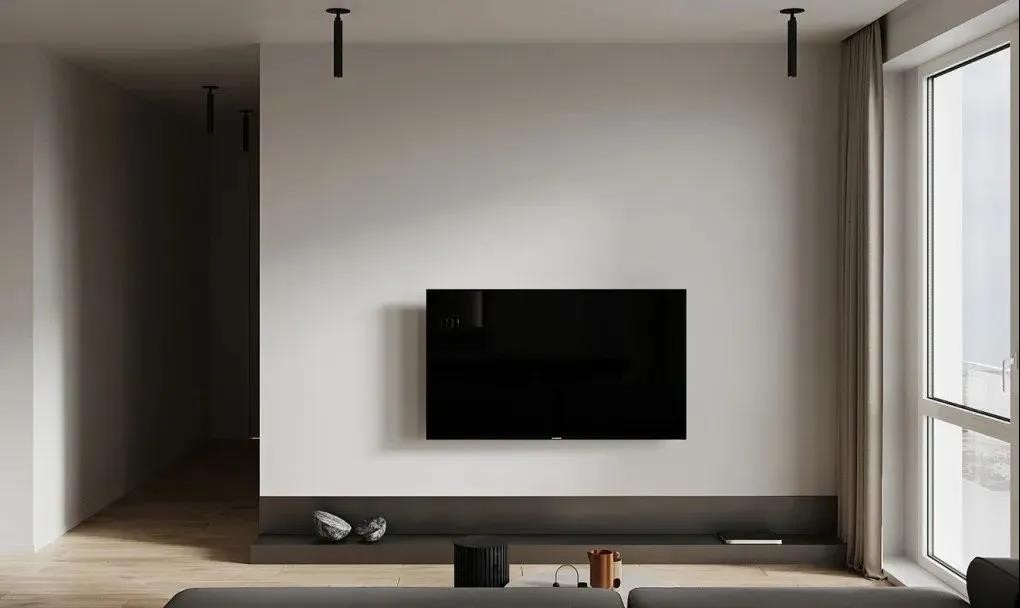 电视悬挂上墙,利用一段深色横板形成收纳台。