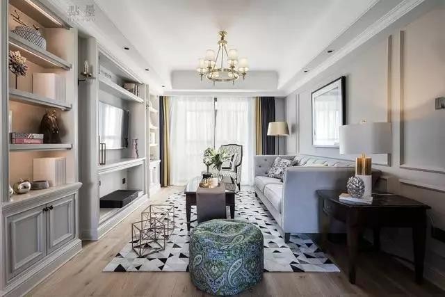 客厅地面铺设的实木地板,电视墙则与传统背景墙有区别