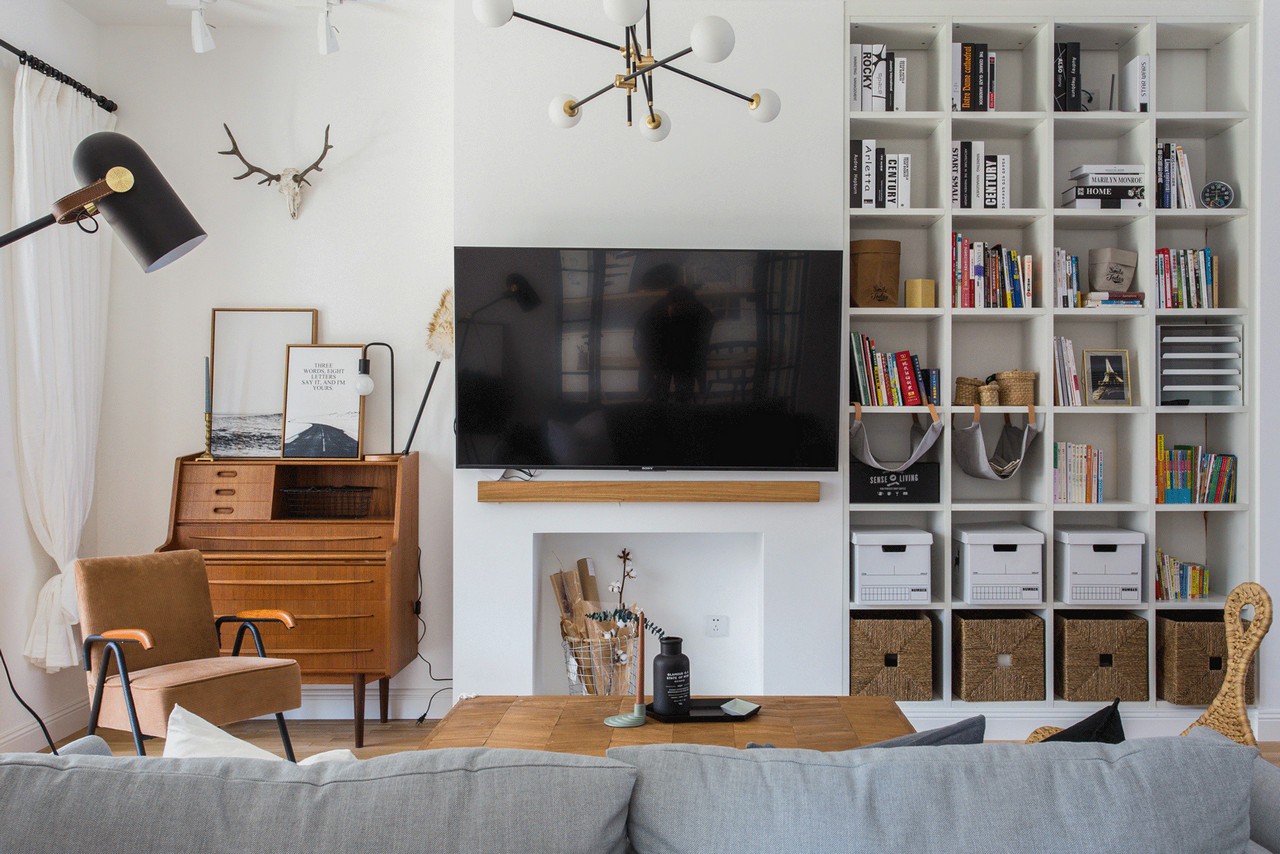 选择三人位的布艺沙发,而不是占地面积大转角沙发,除了成本上有效控制,空间上的占地面积考虑,一字型沙发有限长度,在平日的使用中,累了相互依靠,给夫妇二人倍增亲密感~