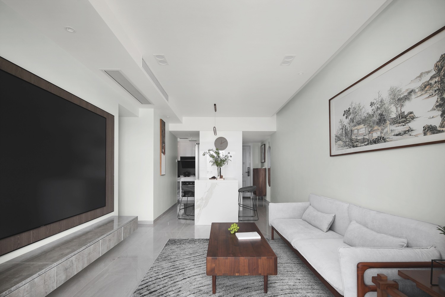 餐桌用吧台替代,悬空的电视柜轻巧精致,能弱化空间里沉重的视觉。