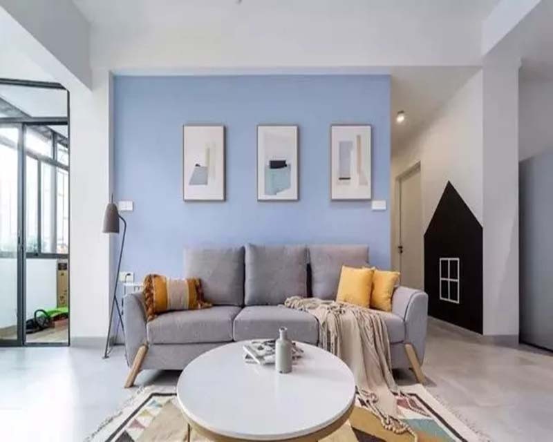 客厅选用灰色布艺沙发与白色大理石茶几,蓝色背景墙使空间更加灵动。