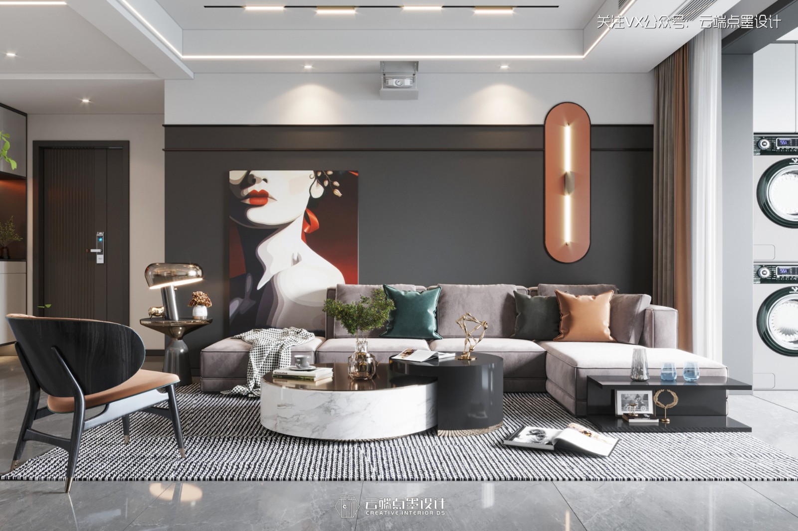 灰白色打底,简洁的投影设计,兼顾了舒适性与独特性,使人完全沉醉与休闲与娱乐时光而没有丝毫疲惫。