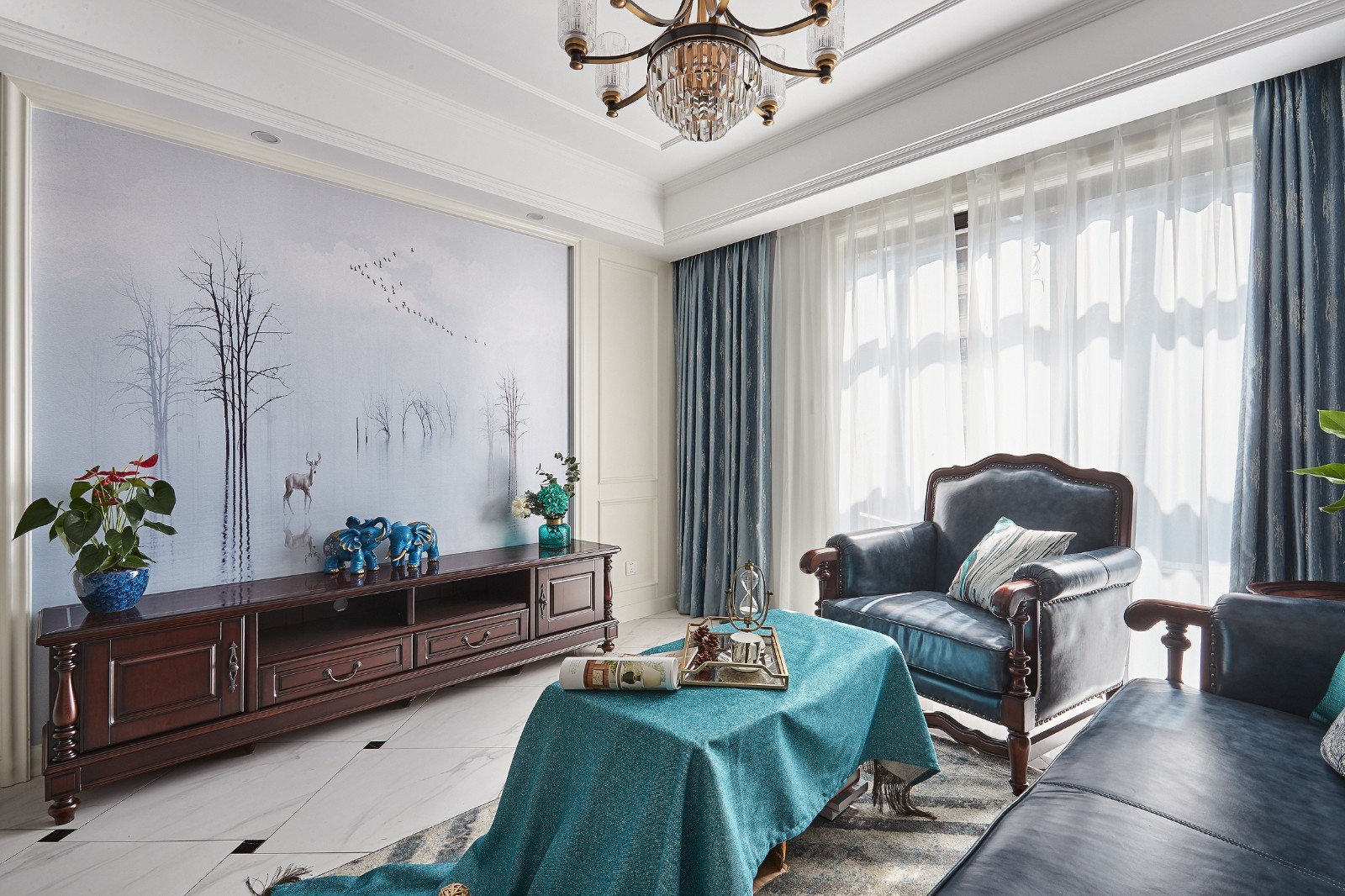 设计解析: 美式风格有文化感、有贵气感,还不能缺乏自在感与情调感。在本案中,孔雀蓝与孔雀绿携手,其深邃、尊贵、优雅的特质结合美式独有的复古家具,共同打造了高贵大气、复古典雅的美式家居。