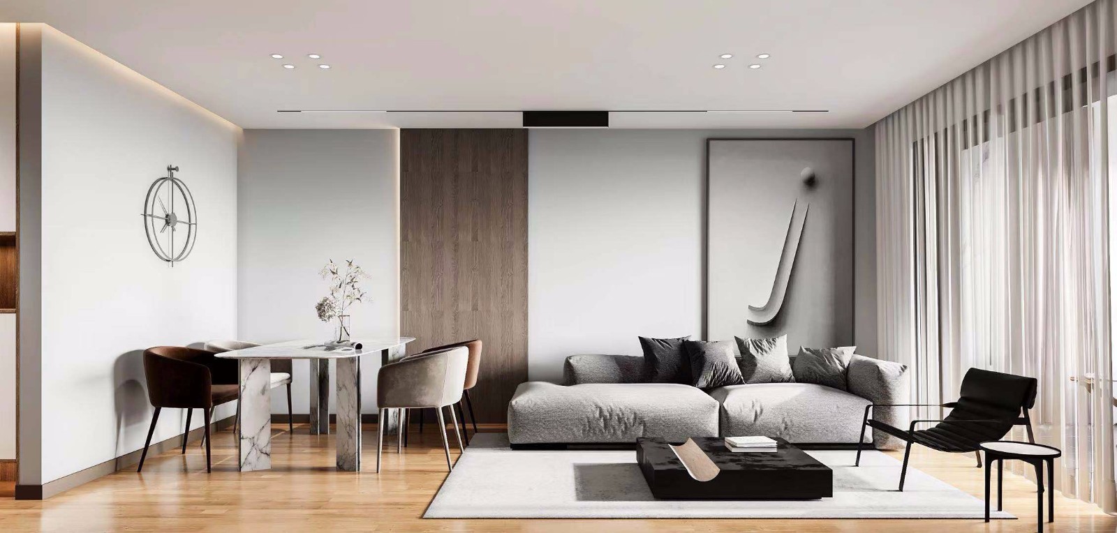 招商原始是精装房,因客户不喜原有装修,所以拆除重新施工,此户型是经典的中间户型,客餐厅一体,两室朝南,厨卫都在北边,所以在整体设计中灯光的使用比较重要,整体风格偏极简,家具看起来轻盈简洁,给人舒适感