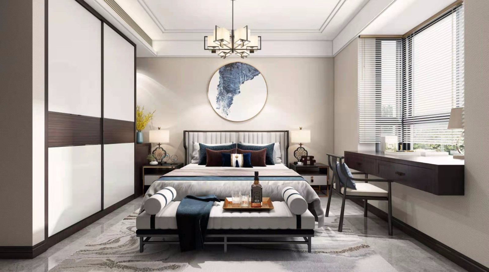电视背景墙的淡墨山水画和壁灯设计把中式的感觉 表现的尤为突出 ,但是沙发墙的蓝灰调设计又给中式风格带来一抹亮色,抛去了传统中式的沉闷感觉,使这个中式亮丽了起来