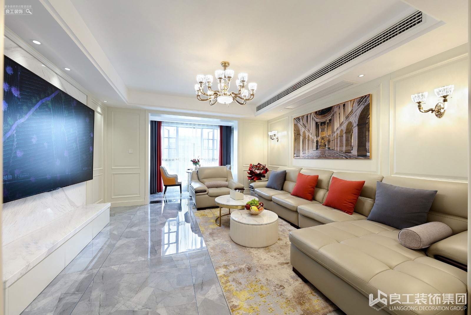 走过玄关门厅跨入客厅,向阳而设的客厅开阔通透,格局宏大。通体的米色护墙板,对称式电视背景墙,赋予空间基底以温馨和淡雅的格调。