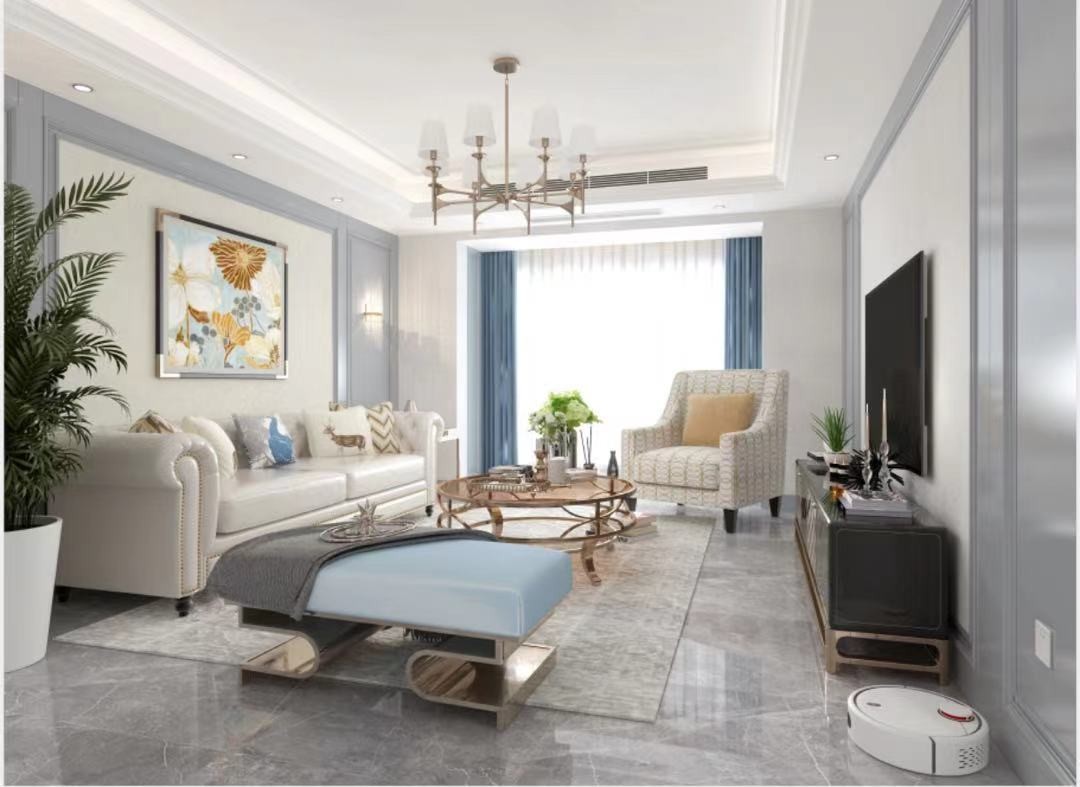 现代美式风客厅的背景色多为淡雅的白色, 再搭配美国人偏好的具有历史感仿古墙地砖。 冷暖色相融, 让你好好享受在客厅的温(lan)馨(ren)时光。